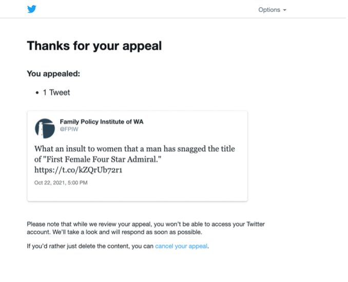 Our team at Family Policy Institute of Washington (FPIW), in fact, remains unable to access our official Twitter account until we remove a tweet that points out that a man is supposedly the first “female” Four Star Admiral.