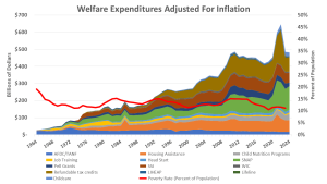 (6) Welfare doesn’t solve poverty. Since Lyndon B. Johnson declared an “unconditional war on poverty” in 1964, some $20 trillion has been spent by way of more than a hundred programs at the national level, plus more state programs. (See video below.) Bob Pfeiffer notes: “While welfare has grown dramatically over the past 60 years, the poverty rate has remained flat. No amount of spending has made much of an impact. In good times and bad, a stubborn 10% of the population is in poverty.” See the red line (“Poverty Rate”) below in the second graphic, amidst a growth in welfare since 1964: