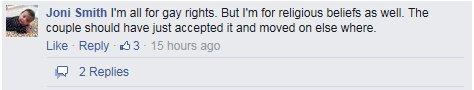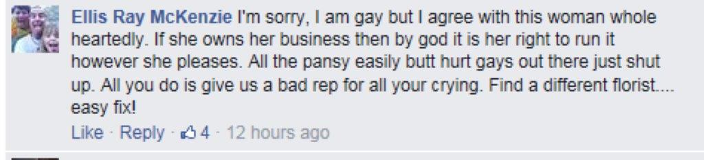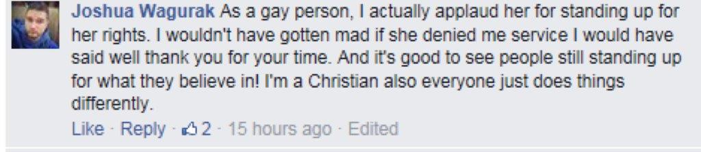 What might be surprising is the amount of support for Mrs. Stutzman from the gay community on the on the Kelly File Facebook page discussing this case. Here is just a sample of the comments.