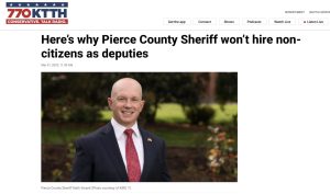• Pierce County Sheriff Keith Swank is another local official who has taken a stand against nonsensical legislation concerning migrants. As Senate Bill 5068, which would have authorize non-citizens to arrest citizens. Law enforcement officers, firefighters, prosecutors, and civil service agents would have no longer been required to be a U.S. citizen nor lawful permanent resident. Swank put his foot down and said, “Not on my watch.”
