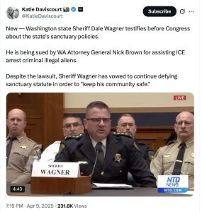 • Adams County Sheriff Dale Wagner had the opportunity to testify before Congress in early April about a tragic incident that occurred in his community in 2021, when “an illegal alien murdered and dismembered a mother and her disabled daughter.” He also spoke about how Attorney General Nick Brown filed a lawsuit against him for helping ICE arrest illegal immigrants in compliance with federal law. Despite backlash from the state, he remains committed to defying sanctuary statutes so he can “keep his community safe.”