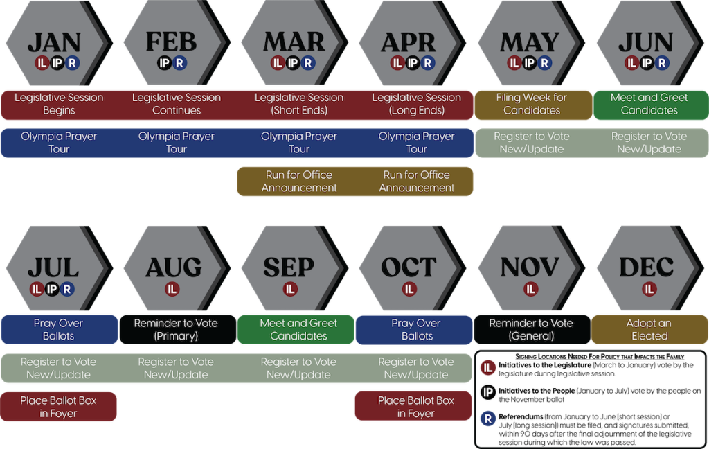 The Family Policy Institute of Washington (FPIW) presents a Strategic Calendaring guide to help churches and individuals actively engage in shaping public policy and culture through a biblical worldview all year long. This guide offers a clear, actionable plan for advocacy and community involvement, including: