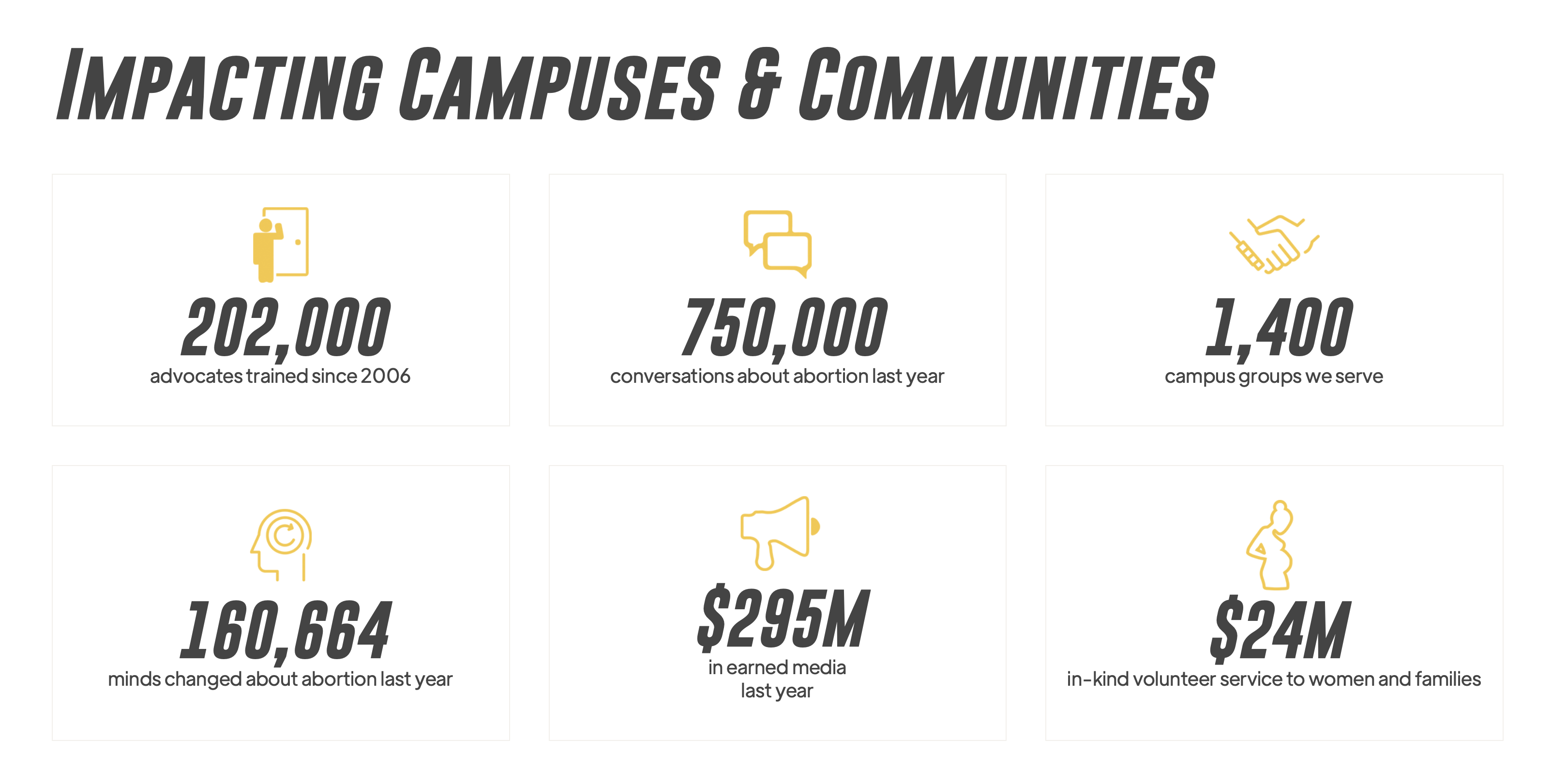 Reduce the Supply & Demand of Abortion – Industry impact deals directly with Planned Parenthood and the rest of the abortion industry. Part of making abortion unthinkable is educating and encouraging potential abortion customers that there are better options for them.
