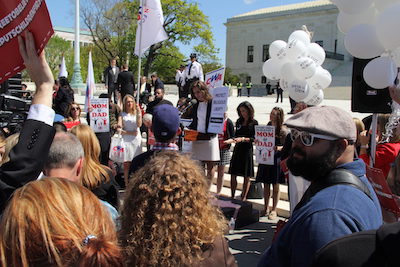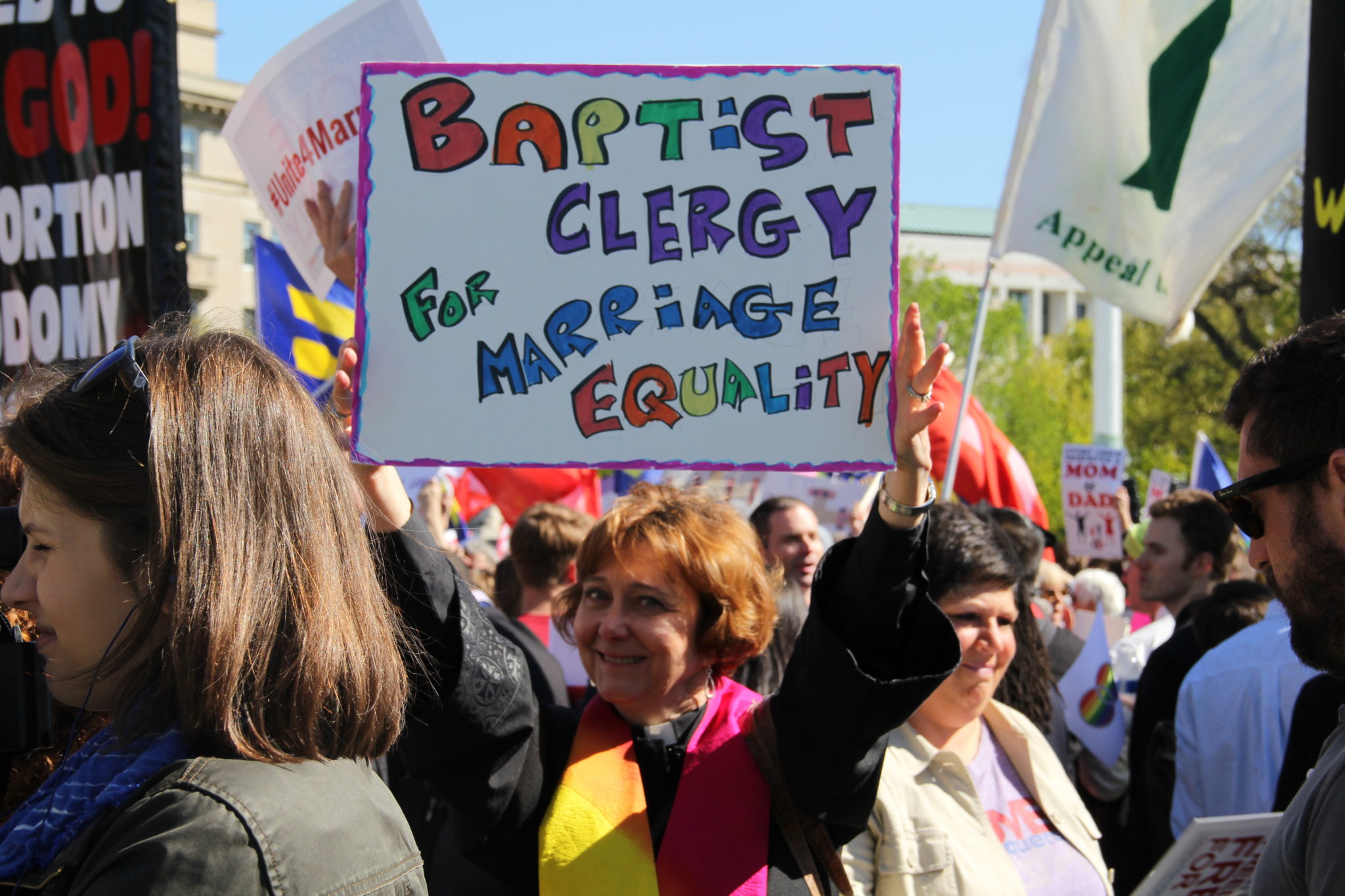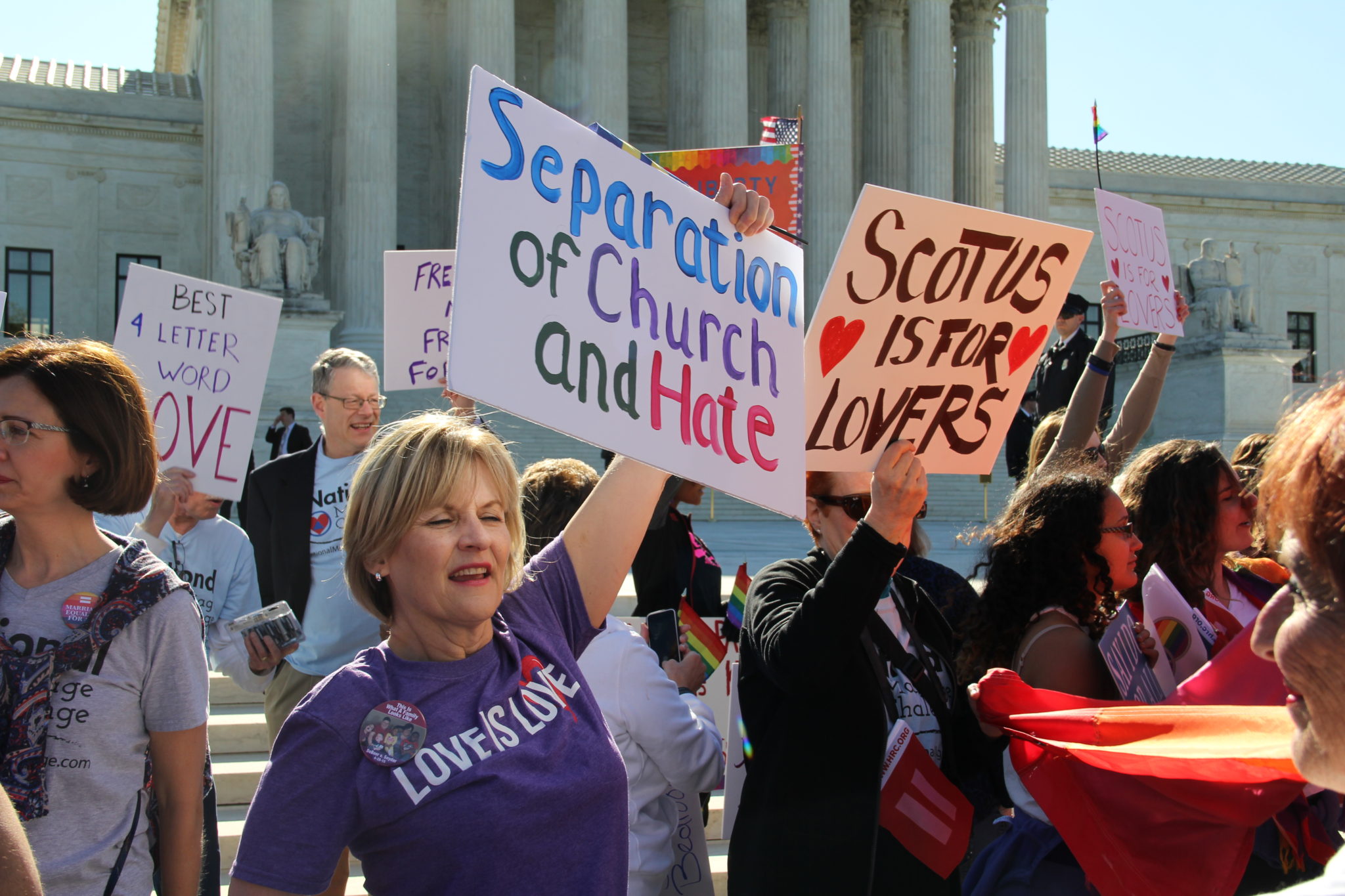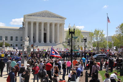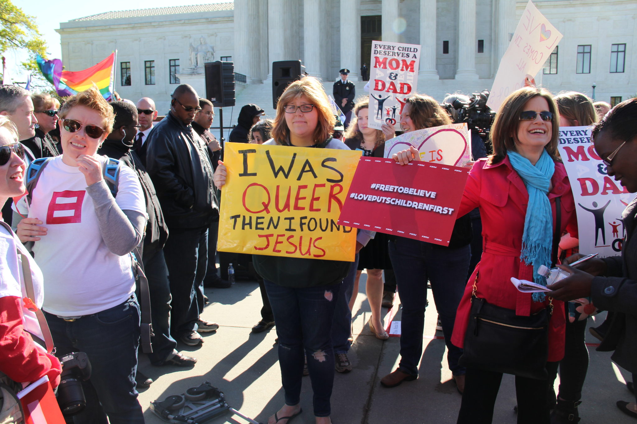 Dueling rallies were organized at the foot of the Court steps in which speakers from both sides, made arguments to partisan crowds for more than two hours. On the edges of the gathering, street preachers and the Westboro Baptists dueled for attention with drag queens.
